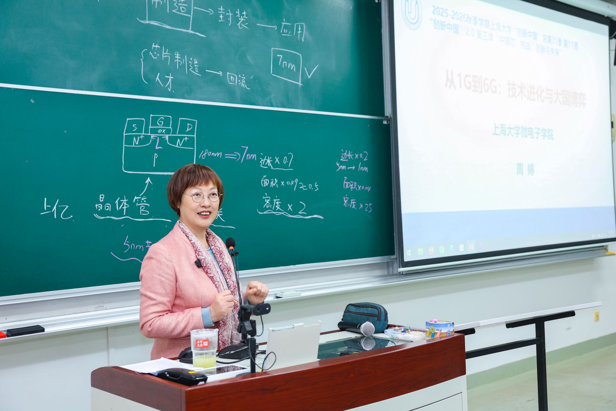 2025年12月3日晚,上海大学“创新中国”第31季课程2.0版第三课开讲。本次课程聚焦“中国芯:挑战、创新与未来”主题,上海大学微电子学院副教授任开琳、上海大学微电子学院副院长周婷教授从芯片制造的核心难题到5G的全球博弈,再到6G的未来图景,为学子们勾勒出我国信息技术领域从“跟跑”到“并跑”再到“领跑”的奋进轨迹。课程负责人、教育部课程思政教学研究示范中心(上海大学)负责人、上海高校思政课名师工作室主持人顾晓英以“项链模式”串联全场,探索信息技术领域“卡脖子”难题的破解之道,点燃青年学子“芯片报国、通信强国”的理想信念。