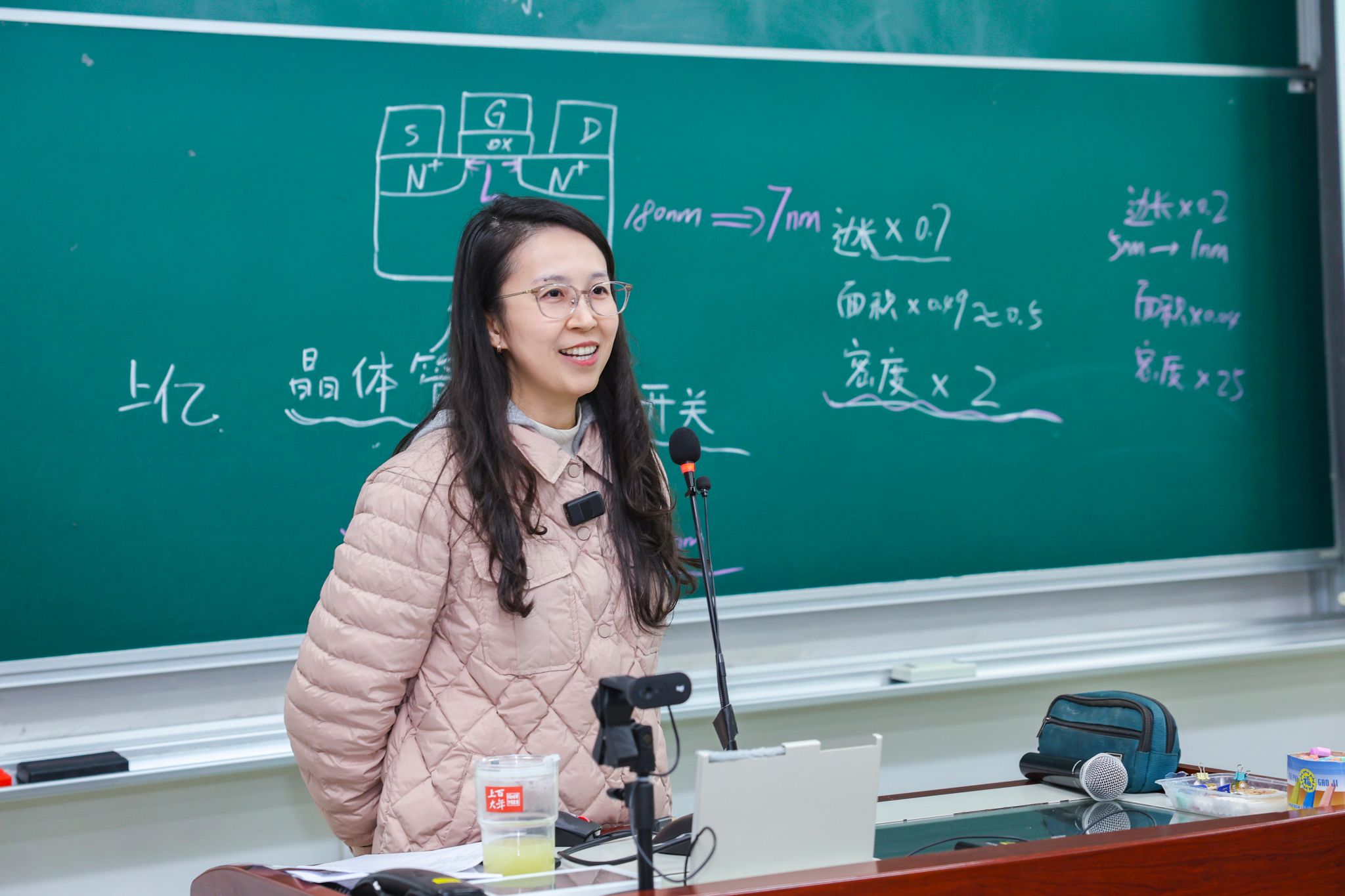 “从5nm到未来的1nm,芯片集成晶体管的密度如何实现25倍跃升?”任开琳老师以芯片制程为切入点,揭开集成电路制造的神秘面纱。任老师从摩尔定律的核心逻辑讲起,用清丽的板书,工整的算式,描摹了“边长缩小0.7倍,面积缩减0.49倍,密度提升2倍”,让学生直观理解集成电路制程迭代的核心原理。她介绍了英特尔22nm节点采用的三维包围式晶体管结构的技术突破,分享了这一技术从1999年概念提出到2015年量产应用的漫长历程,诠释了“基础研究需要坐得住冷板凳”的科研精神。针对我国集成电路产业的发展现状,任老师提到,华为麒麟990芯片早于2019年就实现了7nm设计能力,如今我国集成电路产业链正加速完善,但核心人才匮乏仍是突出瓶颈。为响应国家与上海的需求,上海大学正加速布局微电子领域人才培养。任老师呼吁同学们关注微电子学科,选择微电子专业,有志于在芯片设计、制造、封装测试等领域深耕细作,用专业能力为产业升级赋能,期待更年轻的一代人能有更好的价值观、更开阔的视野、更高的创造力。