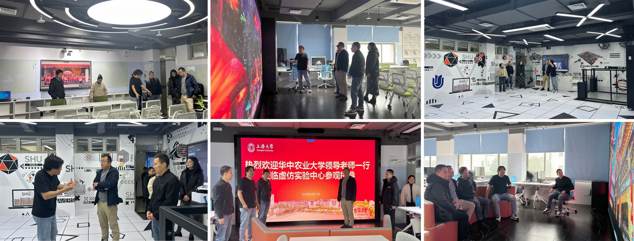 随后,华中农大一行实地参观了C322沉浸式体验教学实验室、C327 LBE大空间体验教学实验室及C329 XR新技术双创实验室,对中心“文化+科技”“艺术+技术”“理论+实践”的融合建设理念,及其在支撑交叉学科建设、激发师生前沿探索方面的成效给予赞赏。